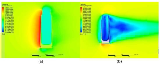 Shell case vertical to free stream: (a) gauge pressure contour and (b) velocity magnitude.