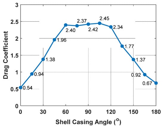 The results of the aerodynamic analysis conducted to obtain the drag coefficient for various AOAs are presented in this section. Figure 8 shows the freestream gauge pressure contour when the shell case is in the upright position as a solution example for the flow field around the shell case. Figure 9 shows the variation in the drag coefficient based on the AOA of the shell. In general, a symmetric shape was observed when the AOA was 90° (upright position), and the value of the drag coefficient decreased as the AOA approached 0 or 180°. A comparison of the drag coefficients at AOAs of 60 and 120° shows that they were slightly lower when the shell hole was in the rear (120°), indicating that the freestream flow exerted a relatively strong pressure on the upper part of the cavity hole at an AOA of 60°. However, when comparing the drag coefficients at AOAs of 0 and 180°, it was discovered that they were higher when the shell case was in the backward position (180°). This is likely because the effect of the base drag caused by the cavity hole of the shell is relatively large.