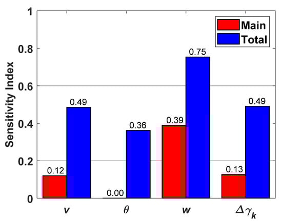 A sensitivity analysis was conducted to determine the effects of the influencing factors on the variation of the output, for example, the distance from the bottom of the aircraft to the shell case. Sensitivity indices were obtained using variance-based methods based on the Sobol’s variance decomposition approach [18]. The sensitivity indices included a first-order index and total index. The first-order index represents the main effect contribution of each input factor to the output variance. The total effect index accounts for the total contribution to the output variation due to each factor, that is, the first-order effect plus all higher-order effects due to interactions.