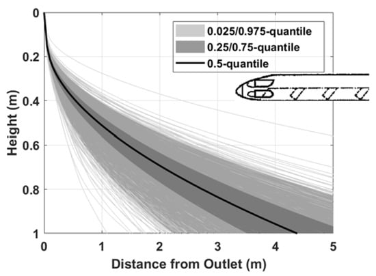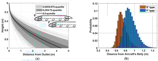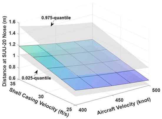 The trajectories of the shell cases ejected from a fighter aircraft are shown in Figure 13a. In addition, the SUU-20 of a single-seater and a two-seater fighter aircraft are illustrated. Although not all MCS trajectories are represented in the figure, the uppermost and lowermost trajectories are included. The results show that the uppermost trajectory passed slightly below the SUU-20 of the single-seater fighter aircraft. Both the horizontal and vertical distances increased for the two-seater fighter aircraft. The nose of the SUU-20 of the two-seater fighter aircraft was below the uppermost trajectory of the shell case, that is, the POC was non-zero. Although the horizontal displacement was greater than the vertical distance, the increased uncertainty in the trajectories increased the likelihood of a collision. All trajectories exhibited a shape similar to that of the median trajectory. Compared with the IQR, the extreme distance of the trajectories from the median increased rapidly. Figure 13b shows an image of the probability mass of the vertical distance from the belly of the aircraft at the nose of the SUU-20. The sample distances were normally distributed but showed slight skewness to the right. The distribution of the vertical distances at the nose of the SUU-20 shifted left with the increase in the variance and skewness for the two-seater fighter aircraft (Figure 13b).