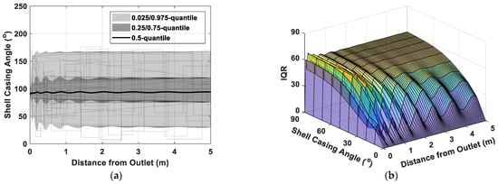 The remaining factors—the aircraft dive angle (θ) and the maximum shell case rotation angle per step (Δγk)—were either small or negligible and hence could not be regarded as the main sensitivity indices. However, the maximum angle indicated an evident interaction with the other factors. Figure 12a shows the shell case angular perturbations over the distance from the gun ejector outlet. The median of the perturbation at each distance was similar to the initial shell angle (90°). The shell angles at each distance were normally distributed. The interquartile range (IQR) changed rapidly during the initial stage. Subsequently, the shell was damped to a steady-state condition. Smooth transitions that occurred at a distance from the ejector outlet were due to an increase in the velocity of the shell cases. The shell angles were changed at equally spaced intervals. The IQR is a function of the maximum shell case rotation angle in each interval. At a small maximum angle, the IQR was narrow, with a median near the initial shell angle. Consequently, the horizontal velocity increased, resulting in a higher POC. Because the IQR increased rapidly, the effect of the maximum angle was limited (Figure 12b).