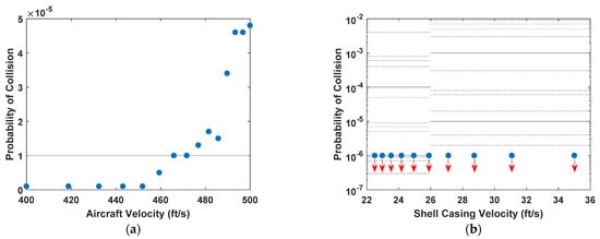 The aircraft velocity and initial velocity of the shell case were the two most influential factors in determining the trajectories. Figure 14a shows the effect of the aircraft velocity on the POC of a two-seater fighter aircraft. In this case, only the aircraft velocity was fixed. The results show that the POC exceeded 10−6 when the aircraft traveled faster than 420 knots. The rapid movement of the shell case in the longitudinal direction reduced the time required for sufficient separation of the shell case from the belly of the aircraft. Figure 14b shows the effect of the initial velocity of the shell case on the collision probability of a two-seater fighter aircraft. In this case, the initial velocity of the shell was a fixed factor. The results indicate that the calculated POC for all cases is below 10−6. If both the aircraft velocity and initial velocity of the shell case are fixed, then the POC will be greater than 10−6 only when the aircraft velocity is 500 knots. The interaction between the two significant factors is important when calculating the POC, as shown in Figure 10.