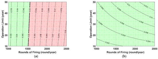 As described in Section 3.1, the projected risks can be used as objective functions for the design or operation optimization. Currently, risks are projected to verify that the risks for the specified operating conditions satisfy the criteria. Although no engine failure occurred, the damages that occurred adjacent to the air intake and shell ingestion through the air intake could not be prevented. Considering the size of the shell case, an ingestion would result in engine flameout. The severity factor for an NRIFSD event was presumed to be 1/6 because five incidents without engine failure were reported in two-seater fighter aircrafts. Figure 15 shows the projected risk of engine failure for a two-seater fighter aircraft owing to the self-collision of the aircraft. In Figure 15a, a feasible region is constrained by the line where the NRIFSD per 100,000 engine flight hours is equal to 0.05. The number of firing rounds was limited to approximately 1500 rounds/year. The ERLOA over the remaining life of the engine was much smaller than the risk criteria of 0.5 (Figure 15b). The margin of the ERLOA was greater than that of the NRIFSD because the target system contained two engines. Hence, a severity factor of 0.036 was used. The risk corresponding to the structural damage was not considered because no critical damage was observed.