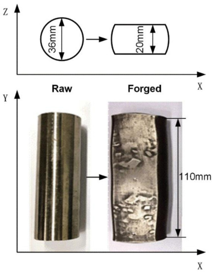 The single-pass compression was performed in Forging Machine DP-C41L13 at a forging temperature of 1020 °C, loading speed of 25 mm/s, and press amount of 16 mm. The depth of the compressed specimen was 20 mm and it was water-cooled immediately. The specimen shapes before and after forging are shown in Figure 2.