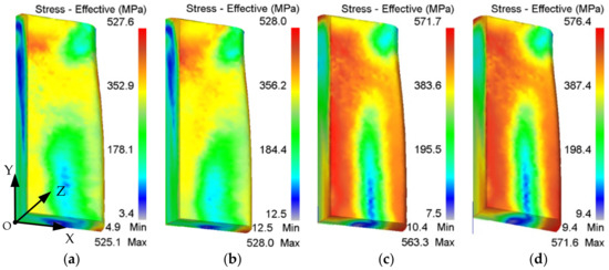 Simulation results of effective stress under V = 25 mm/s and water cooling. (a) T = 950 °C, (b) T = 1020 °C, (c) T = 1040 °C, (d) T = 1100 °C.