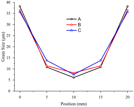 Grain sizes on the central plane (position 3) were taken into consideration. Three positions, A3, B3, and C3, share a similar average grain size of 5 ~7 . The microstructures in Figure 16 show that the stretched origin grains are surrounded by many fine grains. Though the central materials hold high temperatures and large strain, the DRX occurs incompletely due to the short deformation time and immediate water cooling, which results in the coexistence of stretched grains and DRX grains.