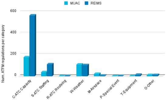For the MUAC region, we have 176 C-ATC Capacity ATFM regulations for en-route traffic along 71 different days, a mean number of regulated TVs per day equal to 2.5, and a mean duration per regulation of 122.02 min. On the other hand, for the REIMS region we have 570 regulations for en-route traffic in 96 days, a mean number of regulated TVs per day equal to 5.96, and a mean duration of 101.2 min.