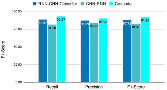 Figure 15 shows the average recall, precision, and F1-Score reported by the three studied hybrid models.