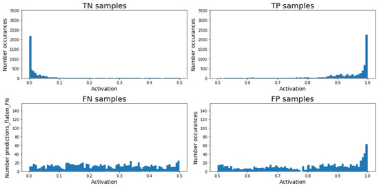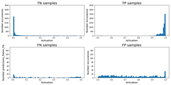 Figure 17. For the FN cases, the model presents a tail between 0 and 0.1, with an accumulation of values close to zero, and the TP cases present a tail between 0.85 and 1. On the other hand, a continuous pattern of behavior can be seen for the FN predictions, with an average value of occurrences under 20. Finally, the FP cases also show a consistent pattern of behavior across activation values between 0.5 and 0.95, and it presents a peak between 0.95 and 1. Nevertheless, the number of both FN and FP are smaller compared with the TN and TP cases.