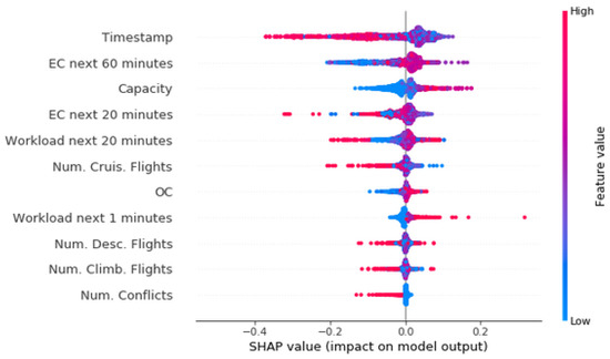 The analysis presents the Timestamp feature as the most relevant, where samples with a smaller Timestamp (early hours of the day) are more likely to contain a regulation. The second most relevant feature is the Entry Count for the next 60 min, where larger values produce a higher activation. Therefore, if a larger number of aircraft are entering the sector, the complexity will increase, and probably a regulation could be required. This is also the case for the Capacity, larger values produce a higher activation. The higher the capacity, the larger the sector, and therefore, more aircraft being more likely to generate an overload. The fourth and fifth most relevant features are the Entry Count for the next 20 min and Expected workload for the next 20 min, which do not present a clear pattern of behavior. The reason could be that they are relevant features but in combination with another. From Number of cruising flights it can be seen that small values produce a higher activation. The Occupancy Count and the Workload for the next minute show the opposite trend. The Number of descending flights and the Number of Climbing flights do not present a clear behavior, which is surprising, because flights in these two phases should be relevant. The fact that the model cannot properly process these features could be a reason why this TV has worse performance. This is also the case for the Number of conflicts, where larger values are creating a smaller activation.