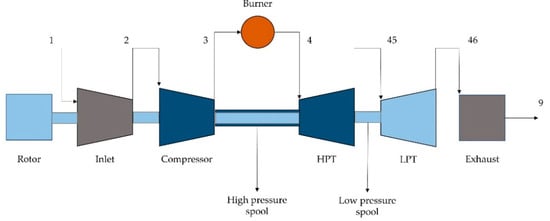 The engine used in this work was a double-spool, lightweight turboshaft designed for helicopter application, derived from the PW200 Pratt & Whitney Canada family. A high-pressure spool connects a single-stage centrifugal compressor to a single-stage high-pressure turbine (HPT), while the low-pressure spool is used to power the rotor (with a nominal speed of 6000 rpm) through a low-pressure turbine (LPT). The model validation was performed in standard sea-level static condition, i.e., temperature = 288.25 K, pressure = 1.013 bar, altitude = 0, and Mach = 0. The airflow rate was changed until power indicated on the engine reference database was obtained. The engine block model is shown in Figure 1, while Table 1 reports some engine parameters in design conditions. The indicated stations in Figure 1 are the following: 1—engine inlet; 2—compressor inlet; 3—compressor outlet; 4—HPT inlet; 45—LPT inlet; 46—LPT outlet; 9—exhaust gases.