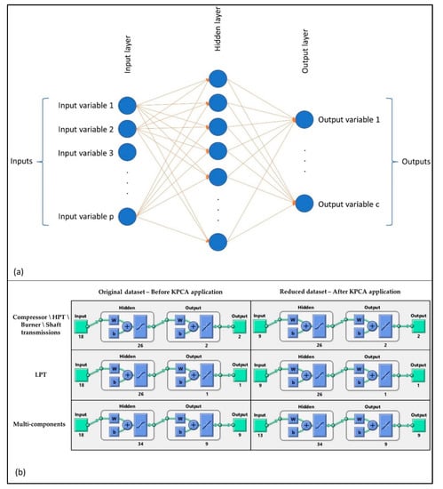 In this work, an FFNN is used to predict the PPs of some selected components constituting a turboshaft engine, i.e., polytropic efficiency and flow capacity for the compressor and high-pressure turbine, polytropic efficiency for the low-pressure turbine, pneumatic and combustion efficiencies for the burner, and mechanical efficiencies for shafts (as called “spools” in the present article). In addition to compressor and turbines, in our work, we also include burner and shafts transmissions, for which the degradation diagnostic is less investigated in the literature. GSP software was used to generate datasets containing information about degraded engines to be used to train neural networks. The just-mentioned datasets are noise-free. The datasets were obtained performing a series of steady-state simulations, each characterized by a different degradation condition (fault type) and severity. The degradation was implemented by changing the value of the PPs in the GSP model used for simulations. The degraded values of the PPs were obtained by an adequate equation between a maximum and a minimum value. Finally, the KPCA technique was used to reduce the amount of data to be supplied to the neural networks. In the past, several studies have used Principal Component Analysis (PCA). However, this technique has a reduced performance when applied to strongly non-linear problems, such as in the case of health monitoring of an aircraft engine. For this reason, Kernel–PCA (KPCA) has been used in this paper to overcome the limitations of conventional PCA to linear problems. ANNs were trained both with the original dataset (as obtained from simulations) and with the reduced datasets (after application of KPCA) and prediction results were compared. Compressor degradation was stimulated by a decrease in polytropic efficiency and flow capacity. Turbine degradation was considered a decrease in polytropic efficiency with both an increase and a decrease in flow capacity. For burner and shafts, degradation was simulated by a decrease in the efficiencies that characterize them.