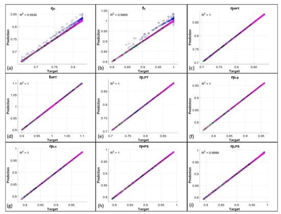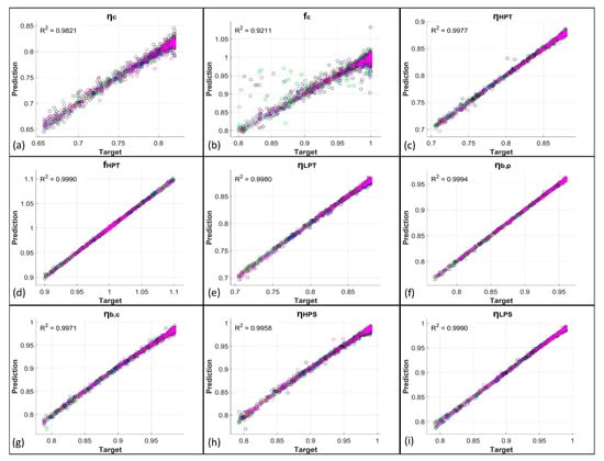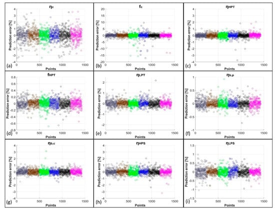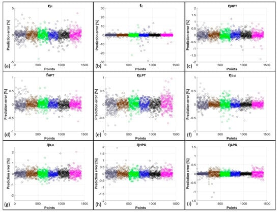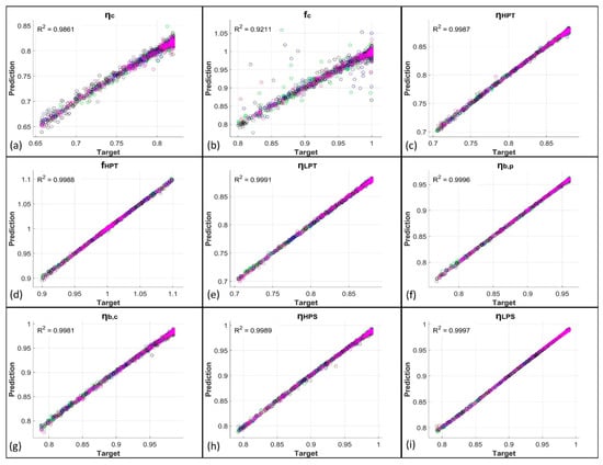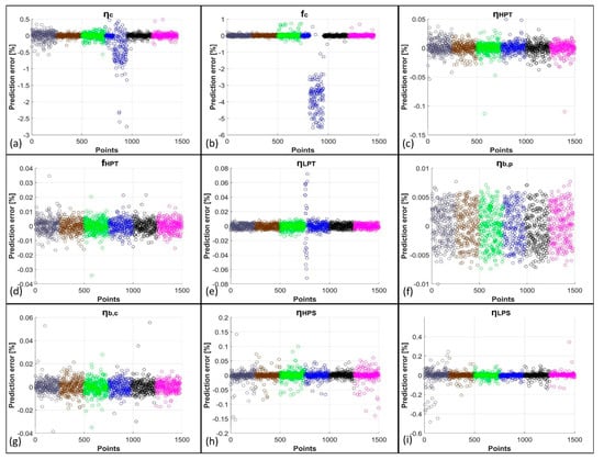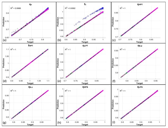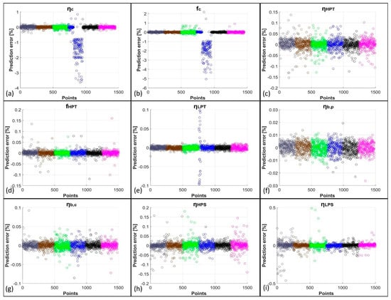 Here, the results obtained from the network predictions, both with and without the use of KPCA, are exposed. Figure 3 shows the comparison between the network predictions and the target values of the PPs obtained from GSP simulations for the first five degradation cases, i.e., for the single-component degradation cases. In more detail, the just-mentioned results are related to the predictions obtained from ANNs trained with the original datasets. Figure 4 reports the related percentage errors. From these first two figures, it is evident how the EHM system developed using only FFNNs shows very good results as R2 (coefficient of determination) values are higher than 0.95; in particular, the lowest R2 is equal to 0.9582, related to fc. The high quality of the prediction is confirmed by the low values of the percentage errors reported in Figure 4. For the compressor case, for which the related PPs are ηc and fc, a peak in error for a well-defined set of points is present at the working conditions MAXPOW-B, i.e., flight in altitude at high power. Percentage errors remain, however, below 6% for these two PPs. The remaining PPs are predicted with percentage errors all below 0.6%. In Figure 5 and Figure 6 instead, the predictions of the same variables by the KPCA + FFNN EHM system are reported. In this case, the results are slightly worse than the previous ones but are still acceptable. The lowest R2 is again related to fc and is equal to 0.9869; therefore, the prediction of fc is even better with the application of KPCA. Peak errors related to the MAXPOW-B working condition are still evident and remain below 6%. The remaining predictions have shown a percentage error below 0.5%. Figure 7, Figure 8, Figure 9 and Figure 10 are related to the prediction of the PPs for the multi-component degradation case and report in more detail the comparison between predictions of FFNN without KPCA reduction and targets, the percentage errors for the predictions of FFNN without KPCA reduction, the comparison between the prediction of FFNN with KPCA reduction and targets, and the percentage errors for the predictions of FFNN with KPCA reduction, respectively. In this case, results are worse than those obtained in the prediction of the PPs in the single-component scenario. This is an unsurprising result because, in this case, the neural networks must predict the nine variables instead of two or only one, as in the case of LPT degradation. However, results for the prediction of FFNN without KPCA remain above 0.92 with an R2 value related to fc equal to 0.9211, which remains the lowest value. The percentage errors related to this case all remain above 5%, except for fc, for which errors remain below 30%. However, it is important to note from Figure 8b that only some points are characterized by a high percentage error. Figure 9 and Figure 10 show the performance for the prediction of the PPs from the KPCA + FFNN system in the multi-component degradation case. Additionally in this case, the lower performance in fc prediction is confirmed with an R2 value equal to 0.9211. Percentage errors of the case do not exceed 4%, except for the fc prediction, whose percentage errors remain below 20%. However, also in this case, only some points are characterized by a higher percentage error.