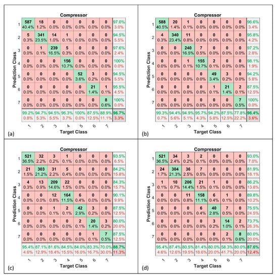 Confusion matrix for compressor. (a): Single-component FFNN; (b): single-component KPCA + FFNN; (c): multi-component FFNN; (d): multi-component KPCA + FFNN.