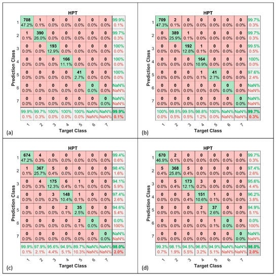 Confusion matrix for HPT. (a): Single-component FFNN; (b): single-component KPCA + FFNN; (c): multi-component FFNN; (d): multi-component KPCA + FFNN.