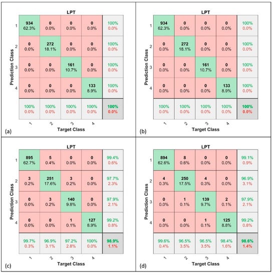 Confusion matrix for LPT. (a): Single-component FFNN; (b): single-component KPCA + FFNN; (c): multi-component FFNN; (d): multi-component KPCA + FFNN.