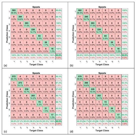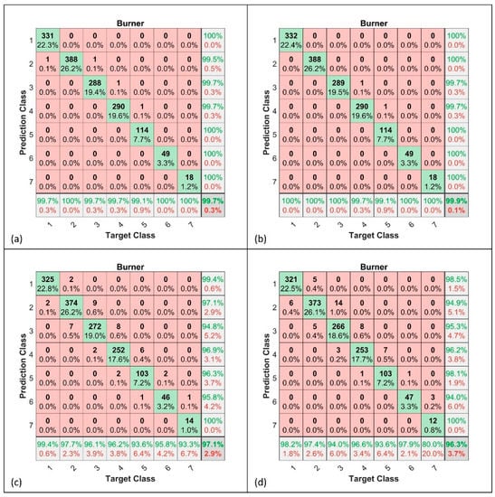 Confusion matrix for burner. (a): Single-component FFNN; (b): single-component KPCA + FFNN; (c): multi-component FFNN; (d): multi-component KPCA + FFNN.