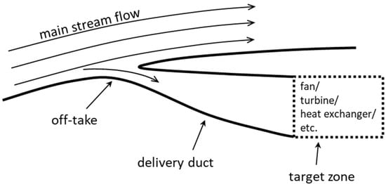 Downstream of the off-take, depending on the application, the flow may be suitable for use directly or it may be necessary to accelerate or decelerate before delivered to the target zone. Therefore, the delivery duct can be of constant or variable cross-sectional area distribution, i.e., a nozzle or a diffuser. The target zone itself represents the region where the diverted flow is utilised. This zone may simply represent a reference section for aerodynamic evaluation or more likely the inlet to an engine, some turbomachinery, a heat exchanger, a manifold, or some other engineering component. The aerodynamic performance of the off-take and delivery duct will determine the overall performance of the application they serve. Inappropriate designs may cause flow phenomena such as flow separation, high levels of aerodynamic blockage, unacceptable total pressure loss and high levels of non-uniformity, hence careful aerodynamic design is needed.