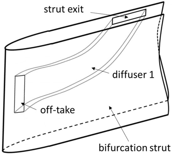 A parameter of importance to the current work is the location of the off-take within the bypass duct. Traditionally the preferred location is on the inner cowl surface which offers a wide surface area as well as easy access to the engine’s core. The drawback is that the quality of the ingested flow is relatively low, due to the thick boundary layers coexisting with the fan outlet guide vane (OGV) wakes. An alternative location would be the upper and lower bifurcations (the large struts in the bypass duct—Figure 2). The trend for increased bypass ratio, to enhance propulsive efficiency, leads to larger bypass ducts and consequently larger bifurcations struts. See, for instance, the work of Clemen et al. [7] who describe the design and optimisation of the bypass duct system on a large civil turbofan engine. This enlargement creates additional volume inside the struts for possible placement of air delivery ducts, hence a submerged off-take on a bifurcation strut becomes an attractive option.