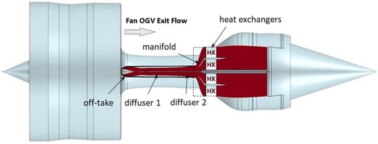 This generic concept is studied on a specific application relating to a cooled cooling air (CCA) system on an aero gas turbine [1]. Briefly, a CCA system uses part of the bypass duct airflow to cool, via an array of heat exchangers (HX), a portion of the core engine airflow, which is then used to cool hot components in the engine core [1,2,3]. The current work considers the low pressure (LP) side of this system. This comprises an aerodynamic off-take that captures the “cooling” air from the bypass duct and a delivery duct that transfers it to the HX.