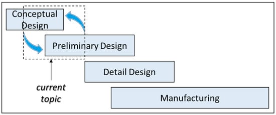 The presented system is a conceptual design. It can be shown via the elementary timeline of a design process in Figure 5, that in an industrial environment there is a significant overlap between different design stages. The purpose of this overlap is to improve efficiency of the workforce. See for instance the description of the aircraft design process as explained by Gudmundsson [10]. More specifically, as the conceptual design stage phases out, the preliminary investigation is already in progress, which provides the opportunity to the conceptualisation team to further develop the concept. A new preliminary design iteration will then follow on the updated concept. This feedback loop continues until the design is mature enough to proceed to the next design stages. In line with the above, the general scope of this paper is to present a single step in the evolution of the above conceptual design, generalised into a suitable method to support the iterative process between conceptualisation and preliminary design space exploration.