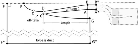 - The axial extent of diffuser 1 (A–C) referred to as “Length”. This variable implicitly determines the position of the off-take along the strut. Low values of length correspond to flush off-takes and high values to total off-takes.