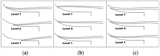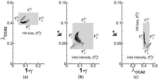 In general, the numerical predictions presented in Figure 26 indicate that depending on the selected optimisation criteria the optimal aerodynamic shape of the manifold can vary significantly. More specifically, the first single-objective optimisation has minimised the pressure loss across the manifold. A typical method to achieve that in simple duct systems is by diffusing the flow early in the duct in order to reduce the average flow speed. However, in the current problem, loss minimisation has a rather more complex relationship to geometrical inputs than that of a simple diffuser due to the conflict between the delivery duct loss and the HX entry loss discussed above. The numerical predictions of the -optimum geometry (Figure 26a–c) indicate that it expands faster compared to the other two single objective optimal solutions (Figure 26d–i). However, it is evident from the contours of velocity and kinetic energy ratio (Figure 26b,c) that the flow of -optimum separates in both s-ducts. Therefore, as seen in Table 7, the -optimum has been achieved at the expense of high penalties in the other two objectives. These include a and increase in the kinetic energy ratio of s-duct 2 and s-duct 1 respectively and a 51% increase of the non-uniformity of s-duct 1. Note that these values are the differences from the overall-optimum geometry.