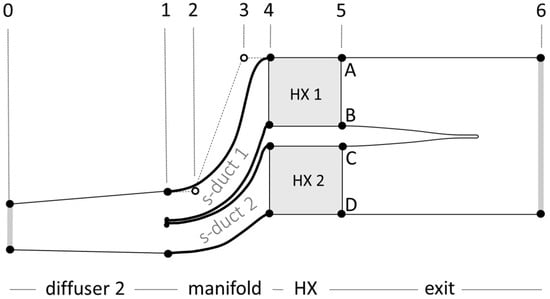 where index “s” corresponds to the captured stream-tube and index “T” corresponds to the target zone. The captured stream-tube condition is defined at an adequate distance upstream of the bifurcation strut and is not significantly affected by changes in the input variables of model 1. There are four different regions where a loss coefficient is evaluated in this work including the loss in the bypass duct (), the loss in the CCA duct of model-1 () and the loss in the CCA duct of model-2 (). Note that the loss across the HX () is incorporated in .