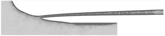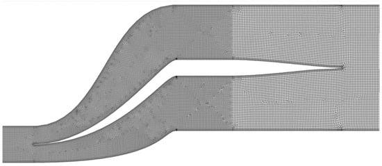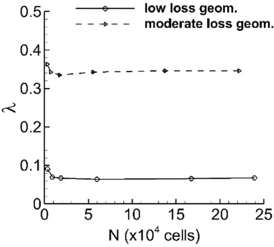 A grid convergence study was conducted for two different geometries taken from model 1. Six different mesh densities in the range 3.0 × 104 ≤ N ≤ 2.5 × 105 were evaluated based on the total pressure loss coefficient of the CCA duct in model 1, . Results of this study are presented in Figure 9 which shows that the total pressure loss changes significantly with mesh density at 2 × 104, but the solution is effectively invariable at mesh density of 5 × 104 or higher and this is therefore the chosen density for the current work. At this mesh density, the off-take mouth is resolved by 20–25 cells depending on the off-take height and the HX inlet face is resolved by 55 cells. Boundary layer inflation is applied on wall boundaries with a growth rate of 1.2. The resulted non-dimensional wall distance varies as , which is compatible with the selected near-wall modelling approach, i.e., standard wall functions. Note that model 1 and model 2 mesh sizes are similar in this work and the details mentioned above apply to both models. Examples of meshing for the two models are shown in Figure 10 and Figure 11 respectively.