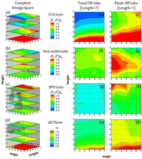 The minimum observation of a design objective, , may approach but it can never equal the utopia point , i.e., . In this study, an estimated value of is selected, meaning that the utopia points are approximated at a level 20% lower than the minimum observations. Since the utopia point is always lower than the value of the objective function, the value of must always be positive. Additionally, on a “bad” design, the objective function could exceed the critical value, , hence, does not have an upper limit. Finally, is the vector of weighting factors evaluated by the decision maker. The relative values of these weights determine the influence of each design-objective in the multi-objective function. It is noteworthy that the vector of scaling factors, , as well as the one of weighting factors, , in Equation (7) are both means of weighting the design objectives. The former is explicitly defined by the physical extremities of the problem and is therefore a more robust way to weight the outputs. However, the later can be very useful when the decision maker wishes to assign different levels of importance to the outputs. A review of multi-objective optimisation methods for engineering can be found at Marler and Arora [21].