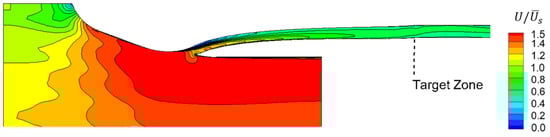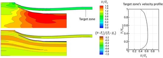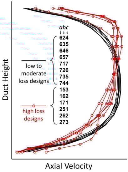 The second single objective optimisation has minimised the non-uniformity of the velocity profile delivered to the HX. As mentioned above, a -optimum can be the result of any combination of events that favours the formation of a uniform velocity profile at the target zone. Here the preferred duct shape for a -optimum design appears to be consistently at an increased angle of approach and of minimal diffusion in the manifold (see Figure 26d–f). This leads to an increased loading at the HX entry. Table 7 shows that this increased loading has a large impact to the HX entry loss which for s-duct 1 is higher than that of the overall-optimum. Furthermore, since no significant loading is applied by s-duct 1, there is no significant flow separation in it either. Consequently, the value of kinetic energy ratio is not affected significantly (i.e., it is only higher than the overall-optimum). As mentioned earlier, the lateral displacement of s-duct 1 (ΔY) is larger than that of s-duct 2 which reduces the degrees of freedom of the latter. This has limited the ability of s-duct 2 to form high approach angles to the HX and extensively its ability to limit the amount of diffusion practical upstream of the HX. Furthermore, as indicated by the contours of velocity in Figure 26e, the adverse pressure gradient which is the combined effect of duct’s diffusion and of the concave curvature of the inner wall of s-duct 2, has caused the flow to separate early. This separation has contributed to a considerable increase of the kinetic energy ratio in s-duct 2 which according to Table 7 is higher than that of the overall-optimum.