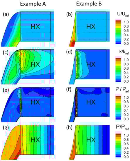 Another important parameter in cooling systems is the uniformity of the flow delivered to the HX. Specifically, mal-distributed feeds can significantly affect the aerothermal performance of a HX, see Kwan et al. [18] and Raul et al. [19]. For this reason, the second design objective of this work is defined as the area-weighted non-uniformity index of the velocity magnitude at the HX inlet face (the target zone), calculated as: