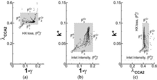 Two suggestions for further improvement of this issue are: (a) increase the amount of diffusion practical in diffuser 1 aiming to relieve the manifold and (b) install inlet guide vanes at the front of the HX to support the steep turning. Furthermore, the current results suggest pushing further the flow turning at HX inlet, i.e., beyond the limitations of the current parametrisation. Two alternative approaches would be: (i) to explicitly define the s-duct exit angle as a separate design variable and (ii) to increase the order of the Bezier curve from third to fourth in order to increase the degrees of freedom of the s-dust geometry. While these modifications require the addition of new variables, with the help of the present data the existing number of variables can be reduced. For instance, in the next design stage the design space can be narrowed down closer to one of the nominal designs shown in Figure 26 and Figure 27. For each of these nominal designs certain variables are ineffective, therefore, can be set as constants. However, the actual candidate to proceed to the next design stage depends on the current needs of the greater system, in this case this is the full CCA system which consists of other subsystems that evolve in parallel.