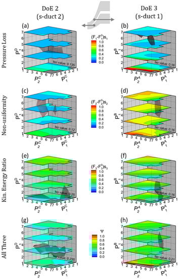 Expectedly, this recirculation has severely affected the non-uniformity of s-duct 2, i.e., it has increased by compared to the overall-optimum as shown on Table 7. On the other hand, the increased velocity in s-duct 1 has severely affected the system losses, which in fact have exceeded the acceptable limit () of DoE 3. Figure 26g illustrates the effect of this extreme loss to the total pressure field and Figure 26h its effects on the velocity field. The latter indicates that there is an imbalance in mass flow between s-duct 1 and s-duct 2. Given that model 2 has a single inlet and a single exit, the mass flow balance between s-duct 1 and s-duct 2 is determined by the individual system losses. However, since the HX loss is dominant in model 2, the mass flow imbalance between s-duct 1 and s-duct 2 is in general low, i.e., with minimal variations for for the majority of the design space, where is the mass flow rate at the inlet of model 2 and is the deviation of the actual mass flow from an ideal mass flow split. Exception to this is a narrow region in the design space of extremely imbalanced designs, such as the one of -optimum, where values of mass flow imbalance of up to are observed.