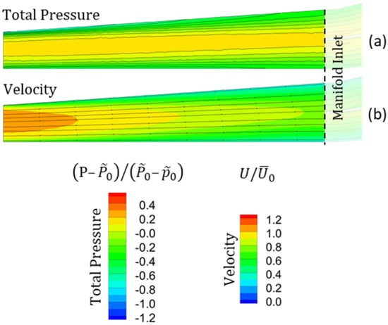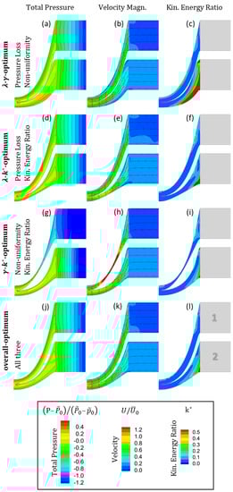 A comprehensive understanding of the aerodynamic behaviour of the manifold in the explored design space requires that a representative sub-range of designs from DoE 2 and DoE 3 are individually characterised. A sub-range is selected so that all analysed designs are aerodynamically optimal, based on one or more of the selected design objectives. More specifically, a design objective, , can be excluded from the multi-objective function by setting the respective weighting factor to (see Equation (7)). Conversely, the value of can be used so that a given design objective is considered. With this method all seven combinations of weighting have been considered in both DoE 2 and DoE 3. The fourteen individual optimal s-duct designs are then combined to create the seven corresponding instances of the complete manifold. Contours of normalised total pressure, velocity magnitude and kinetic energy ratio of the seven optimal manifold designs are illustrated in Figure 26 and Figure 27, corresponding to single objective and multi-objective optimisations respectively. Note that for consistency Figure 25, Figure 26 and Figure 27, share the same contour ranges. The manifold design that exhibits minimal aerodynamic losses is referred to as “-optimum”, the one that minimises the non-uniformity as “-optimum” and the one that minimises the kinetic energy ratio as “-optimum”. Similarly, the two-objective optimisations are referred to as “--optimum”, “λ--optimum” and “--optimum” respectively. Finally, the three-objective optimal design is referred to as “overall-optimum”, not to be confused with the true optimum, which, as explained above is unattainable with the present sampling method.