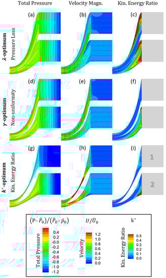 Contours of normalised total pressure, velocity magnitude and cell based kinetic energy ratio on the three single-objective optimal solutions: λ-optimum (a–c), γ-optimum (d–f), and k*-optimum (g–i).