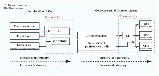 - Average temperature response: Another metric that measures the climate impact in terms of temperature change is average temperature response (ATR) [33,49]. ATR is a derivative metric of GTP which combines the integrated temperature change for different emission scenarios and time horizons. Some functions (called climate change functions) have been developed within the EU-projects REACT4C, ATM4E, and FlyATM4E to quantify the climate impacts of each agent in terms of ATR. In Section 4, the employment of such functions for climate optimal trajectory planning will be reviewed.