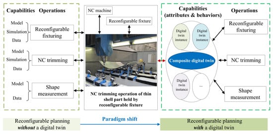 The efficiency and effectiveness of reconfiguration planning are some of the most important issues in RMSs [43]. Regarding the reconfigurable fixturing planning for the trimming operation of thin shell parts, its basic task is to transfer the information of the desired model into the location information of the reconfigurable fixture, but the parallel and very different requirements of location accuracy and holding stability throughout the whole process of trimming make the decision making of deterministic locating thorny. For instance, due to the complex interaction dynamics that involves the multipoint location, the low rigidity of thin shell parts, and the ongoing separation of the desired shape, the cliff effect where the stiffness of the fixturing system obviously steps down is very likely to emerge unexpectedly [7]. This emergent behavior would bring out potentially harmful effects or waste expensive large-size thin shell parts owing to out-tolerance, so it needs to be eliminated through reconfigurable fixturing planning. Previous works of modeling and “front-running” simulation analysis provide the necessary foundations for the decision making of reconfiguration planning [6,7,44], but the concept of digital twins tends to integrate the multidisciplinary and multiscale models and bottom-up data of the production site into an actionable continuum. Largely speaking, especially according to our engineering practice in the reconfigurable manufacturing of aircraft skins [2], transforming an RMS into a digital twin-embedded CPS is a natural transition, not a disruptive leap.