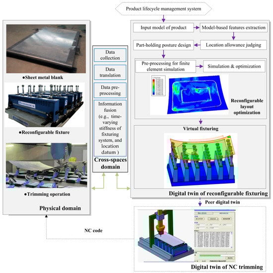 Specifically, the complex interaction dynamics that involves multipoint holding, the low rigidity of the thin shell part, and the ongoing separation of the desired shape causes the reconfigurable fixturing and trimming process to be full of high complexity and uncertainty. To alleviate this, a digital twin-based reconfigurable fixturing planning framework was presented by combining the simulation optimization method and the online measurement in the real process. The simulation optimization in the virtual space successfully generated a layout recommendation and a reference criterion for the real process control. The unpredicted undesirable problem that the stiffness of the fixturing system dramatically drops down was successfully identified and eliminated. Clearly, the digital twin-based model that characterizes the whole environment could provide a holistic and contextual insight into the complex process, rather than simple abstractions of reality investigated in a highly fragmented fashion. Philosophically, this indicates that industrial modeling and cybernetics are transcending the traditional rigid system into the digital ecosystem.