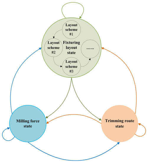 From the foregoing discussion, owing to the progressive separation of the desired shape from that of the blank part throughout the whole trimming process, the interaction dynamics of the whole trimming process is highly time-variably nonlinear and has a complex state space that involves heterogeneous variables such as the location layout, machining forces, and trimming route. Obviously, the stiffness representation of the fixturing system cannot be directly characterized by an analytic method, so the hidden Markov model (HMM) was used to describe the complex coupling effects of heterogeneous variables on the in-process stiffness of the fixturing system (see Figure 3). Further, the FEM simulation model was adopted to simulate the material removal process and estimate the maximum fluctuation amplitude of the dynamic deformations [7]. The FEM method can perform batch simulation calculations of the in-process stiffness of the fixturing system, and according to the simulated results, the HMM further drives the combinational optimization of heterogeneous variables with the conditional probabilities in the allowable state spaces. That is to say, the interaction dynamics model of the whole trimming process is built in the virtual space by the combination of HMM and FEM. The FEM simulation method was developed in a previous work [7] and is not further covered here. Next, the layout optimization method of RFs is introduced.