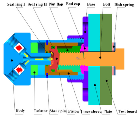 The structure of a low-shock separation nut is shown in Figure 1. The separating and unlocking mechanisms include the body, inner sleeve, piston, shear pin, nut flap, sealing ring, end cap and other parts.