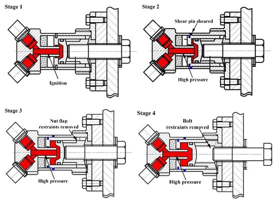 - Lee, J.; Han, J.-H.; Lee, Y.; Lee, H. Separation characteristics study of ridge-cut explosive bolts. Aerosp. Sci. Technol. 2014, 39, 153–168. [Google Scholar] [CrossRef]