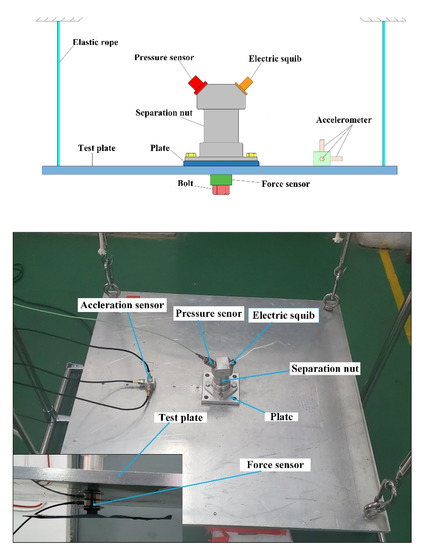 To simulate the axial gravity-free state of the separation device of the inter-stage cabin and reduce the interference of the external environment on the sensor, the test plates (600 mm × 60 mm × 10 mm) are lifted by four flexible elastic ropes. The connecting plate is connected to the test plates to simulate the separation state. The test system is shown in Figure 7.