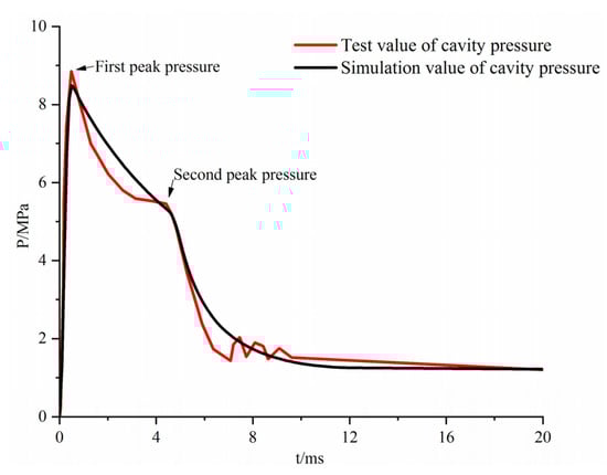 To analyse the pressure change process more intuitively, the values of the pressure and time of the first peak and second peak, as shown in the curve of Figure 6, are compared and presented in Table 4. The relative errors of the key pressure parameters are 1.30%, 1.96%, 3.48% and 2.97%, which are all less than 5%. This shows that the simulation model can accurately predict the variation law of the pressure in the cavity during the action of the separation nut and accurately describe the motion law of the separation nut mechanism.