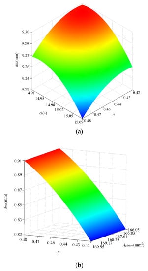 Response surface of the Kriging model. (a) dsle~(α, n). (b) dnut~(Apiston, n).