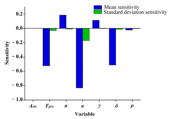 The random variable sensitivity analysis results of the inner sleeve separation and nut flap separation described by Equation (31) are presented in Figure 13 and Figure 14. Figure 13 shows the dimensionless reliability sensitivities of the inner sleeve separation. Among these, n and γ positively affect the results of the mean sensitivity analysis; that is, increasing the mean value of these parameters improves the reliability of the inner sleeve motion. Parameters d, Asle, Fpre, α and ρ have a negative effect on the mean sensitivity; in other words, reducing the mean value of its parameters improves the separation reliability of the inner sleeve. The sensitivity results of the standard deviation indicate that reducing the standard deviation of each variable aids in improving the motion reliability of the inner sleeve. Similarly, Figure 14 shows the dimensionless reliability sensitivities of the separation of the nut flap. The mean sensitivities of n and γ are positive value, so the reliability increases as the mean of n and γ increase. The mean sensitivities of Fpre, Apiston, α, δ and ρ are negative values, so the reliability decreases as the mean of Fpre, Apiston, α, δ and ρ increase. The standard-deviation sensitivities of n, Fpre, Apiston, α, δ, ρ and γ are negative values, so the reliability decreases as the standard deviations of n, Fpre, Apiston, α, δ, ρ and γ increase.
