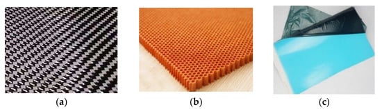 Main materials of honeycomb sandwich panel: (a) carbon fiber preimpregnated cloth; (b) nomex paper honeycomb; (c) epoxy resin adhesive film.