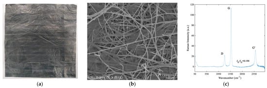 In this study, CNTF (JCNTF-20C, Jicang Nanotechnology Co., Ltd., Nanjing, China) was fabricated by the floating catalytic chemical vapor deposition (FCCVD) method. FCCVD is a relatively simple and low-cost method to produce CNTF. The hydrocarbon source, iron source and sulfur source were continuously injected by flowing hydrogen-carrying gas into the reaction furnace above 1000 °C. Then, CNTs started to grow and entangle together due to Van der Waals forces to form an aerogel sock, which was collected in reels and then densified into CNTF. The as-received CNTF and its related material properties characterized by scanning electron microscopy (SEM) and Raman spectroscopy (RS) are shown in Figure 2. As can be seen from Figure 2a, the surface of the CNTF was relatively uniform and smooth, its thickness was about 12μm and its conductivity was about 1.1 × 105 S/m. Figure 2b shows the random staggered entanglement of CNTs in CNTF and its high porosity, which can help infiltration of resin improve the binding between the film and the panel. Raman spectra of CNTF in Figure 2c showed that the value of ID/IG was small, and the G peak was sharper and denser than the D peak, indicating that the graphitization degree of CNT was good.