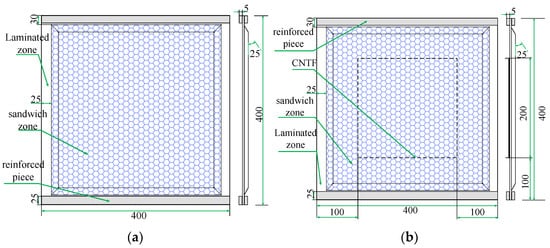 When preparing specimens, first, a square CNTF was laid at the center of the carbon fiber preimpregnated cloth (this step can be ignored for unprotected specimens). Then, the carbon fiber preimpregnated cloth, epoxy resin adhesive film and honeycomb core material were laid in a certain sequence and encapsulated together into a vacuum bag. Finally, the specimens were cured and formed under 180 °C and 340 kPa. After curing, the specimens were taken out and machined, and the final specimens are shown in Figure 5.