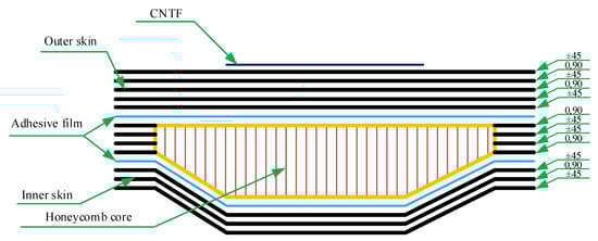 Compared with traditional composite laminates, honeycomb sandwich composite structures have good impact resistance and weight reduction characteristics and have been widely used in various aircraft structures []. For example, in the Airbus A380, the belly fairing, the nacelles, the front landing gear doors, some ailerons and the rudder are all made with sandwich structures []. The honeycomb sandwich panel in this study was mainly composed of carbon fiber preimpregnated cloth with about a 40% resin volume fraction (T300, Jiangsu Tian Niao High-tech Co., Ltd., Wuxi, China), Nomex paper honeycomb (JY1-3.2-48, Jiangsu Jun Yuan New Materials Co., Ltd., Nantong, China) and epoxy resin adhesive film (TS-JM-200, Shandong Wei Hai Guang Wei Composites Co., Ltd., Weihai, China), as shown in Figure 1.